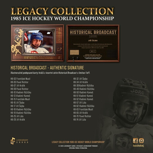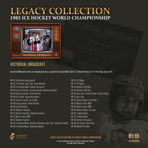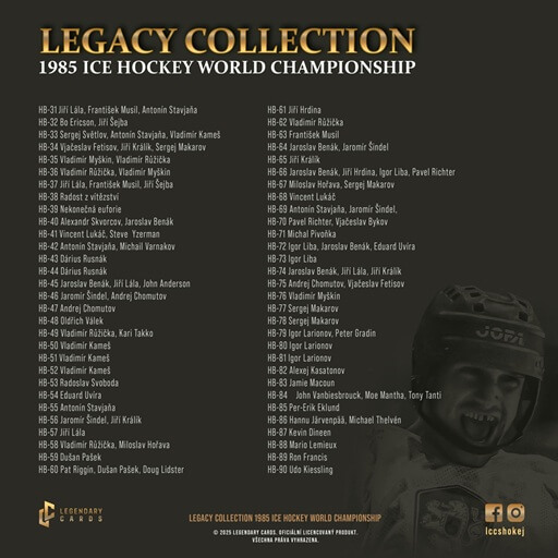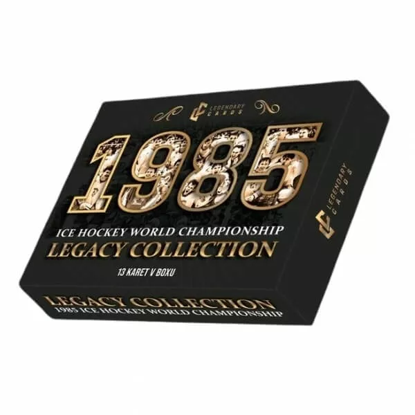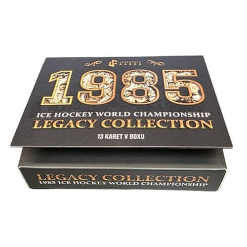 Hokejové karty Legendary Cards Český hokej 1985 Collectors Box vydané k příležitosti 40. výročí Mistrovství světa v ledním hokeji v Praze roku 1985. Balení obsahuje 13 - 14 sběratelských karet.