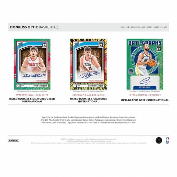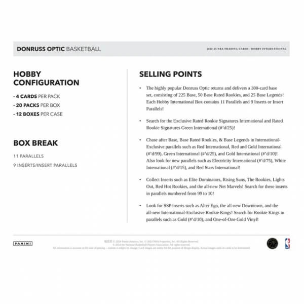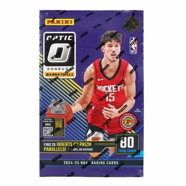 2024-2025 NBA karty Panini Donruss Optic International Hobby Box je balení sběratelských karet NBA. Balení obsahuje 20 balíčků po 4 kartách. Celkem tak získáte 80 vzácných karet. Jedná se o produkt vhodný pro pokročilé sběratele, protože v něm získáte velký počet speciálních karet, které obohatí Vaší sbírku.