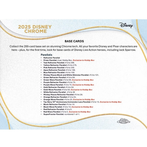Collect the 200-card base set on stunning Chrome tech. All your favorite Disney and Pixar characters are here - plus, for the first time, look for base cards of Disney Live Action heroes, including Jack Sparrow.