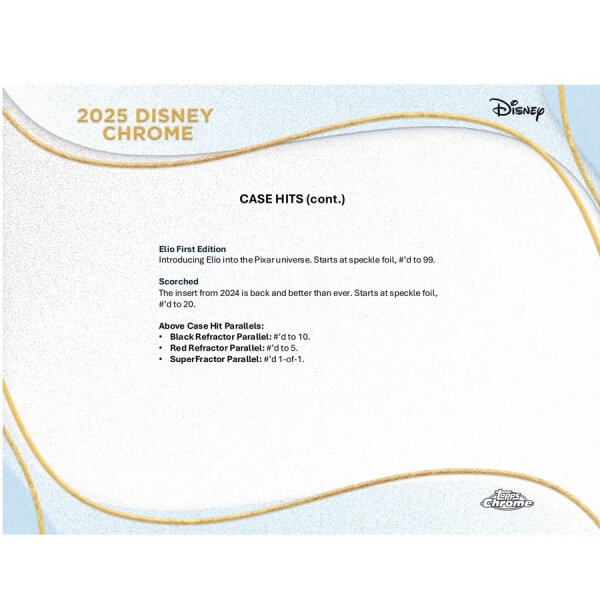 Back for another year, these thick Chrome cards celebrate some of the strongest Disney icons. Starts at speckle foil, #'d to 20.