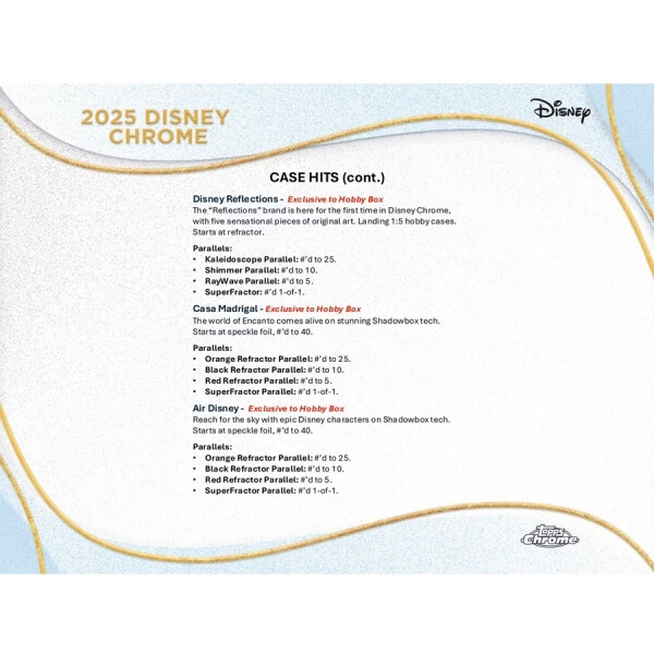 The "Reflections" brand is here for the first time in Disney Chrome, with five sensational pieces of original art. Landing 1:5 hobby cases. Starts at refractor.