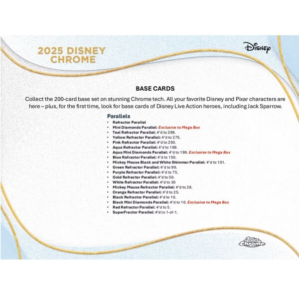 Collect the 200-card base set on stunning Chrome tech. All your favorite Disney and Pixar characters are here - plus, for the first time, look for base cards of Disney Live Action heroes, including Jack Sparrow.